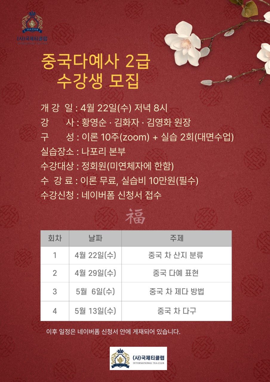 4월 22일(수)부터 중국다예사 2급(민간자격 제2011-0863)과정을